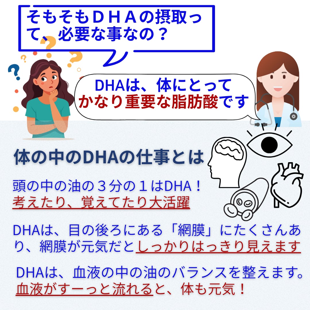 DHA(ドコサヘキサエン酸)は、人間の脳や目の網膜の脂質成分で、脳に直接入って栄養素として機能できる数少ない物質です!